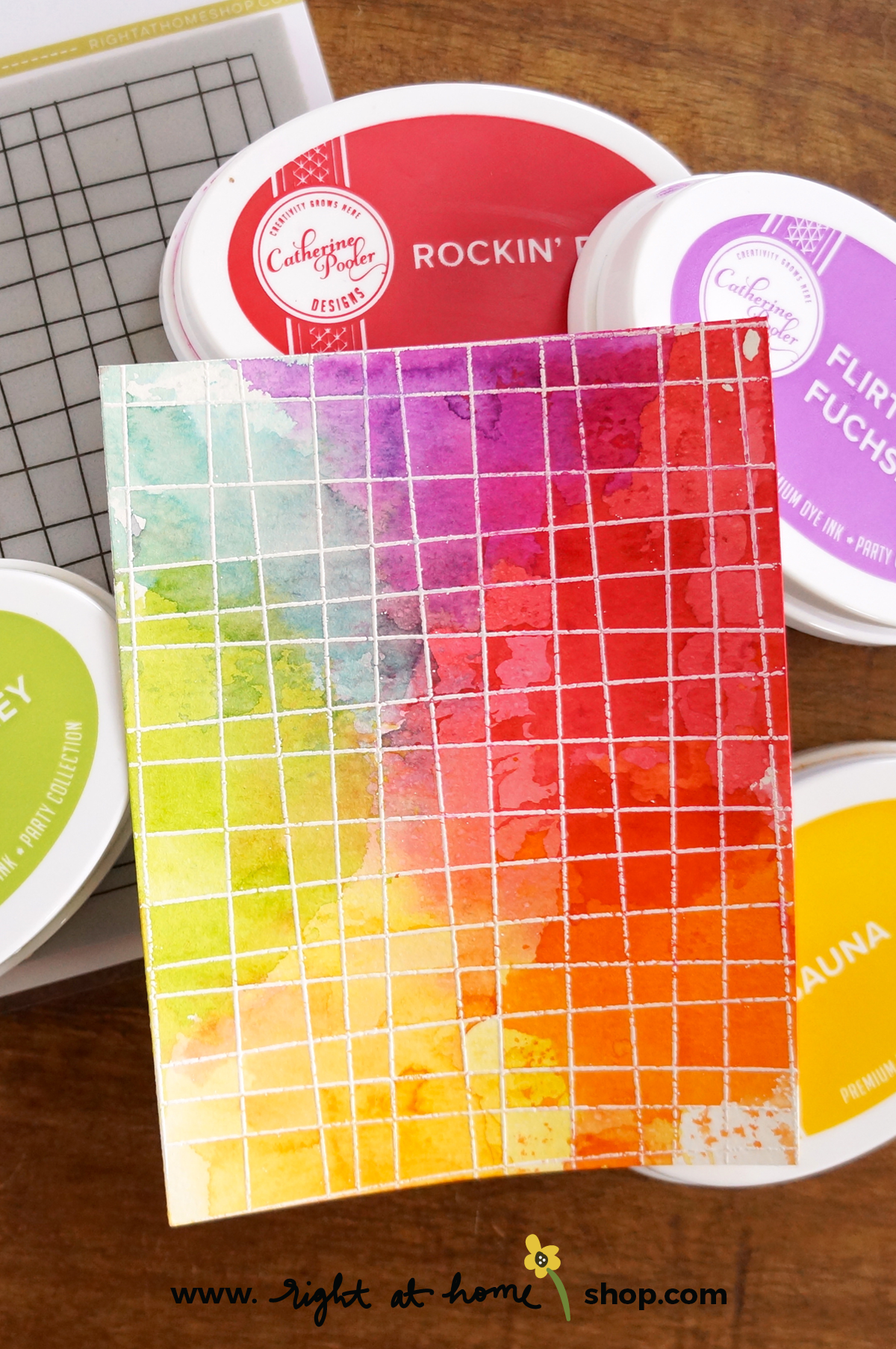 We started with a rainbow color scheme so let’s finish with another one, shall we? This time I’m using my Grid Background Stamp to create a panel perfect for watercoloring! I white heat-embossed the stamp onto a piece of watercolor paper and smooshed a variety of ink colors overtop. Make sure to be careful when placing your colors as to not create a muddy mess of brown ink! The embossing powder resists the inks, revealing the beautiful grid texture.