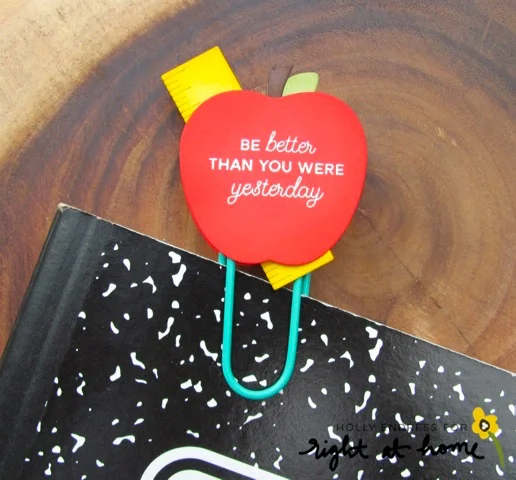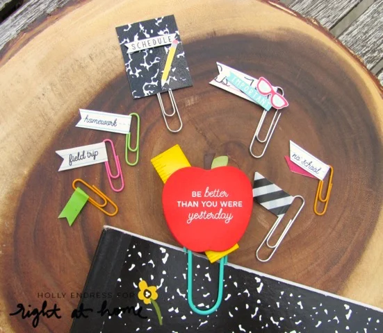 I used the Back to School Die Set to create two different apple clips as well. I used a large paperclip for the one on the left and I added some Distress inks to all the pieces to create some extra depth to the pieces. Then I adhered some foam tape between the layers and and added the paper clip in-between with mini glue dots. For the clip on the right I used a large silver paperclip and secured the clip in the same way. I used some fun patterned paper for the leaves on the apple. I also stamped the notebook paper image from the Back to School Planner set and added a red line and die cut a banner shape from it and adhered it to the apple. This way you could personalize the clip.