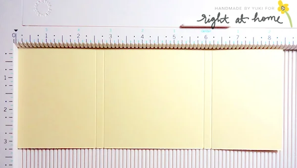 I started off by cutting a piece of yellow cardstock to 3 1/4" x 8 1/2". The width and length of your piece of cardstock may vary depending on the size of your post-its. I then scored the cardstock at 2 1/2", 2 3/4", 6" and 6 1/4". I determined the distance between the score lines closer together by simply measuring the thickness of the post-its. You want to make sure you allow enough room, but avoid leaving too much space to prevent your top flap from sagging. And viola, the base of the post-it note holder is done! Easy peasy right?