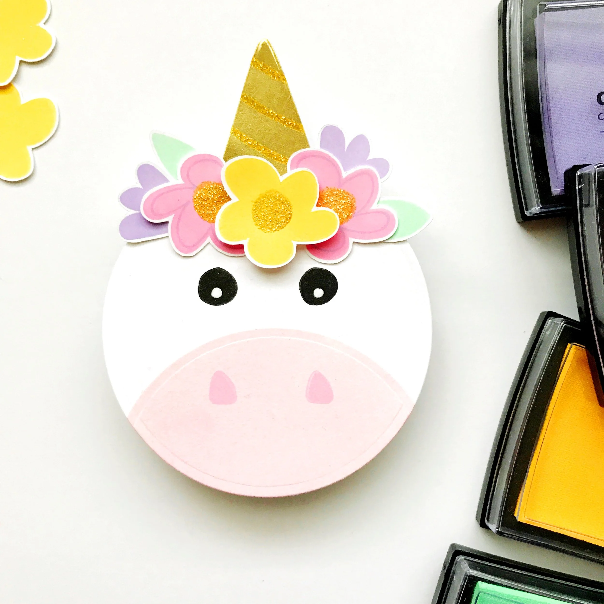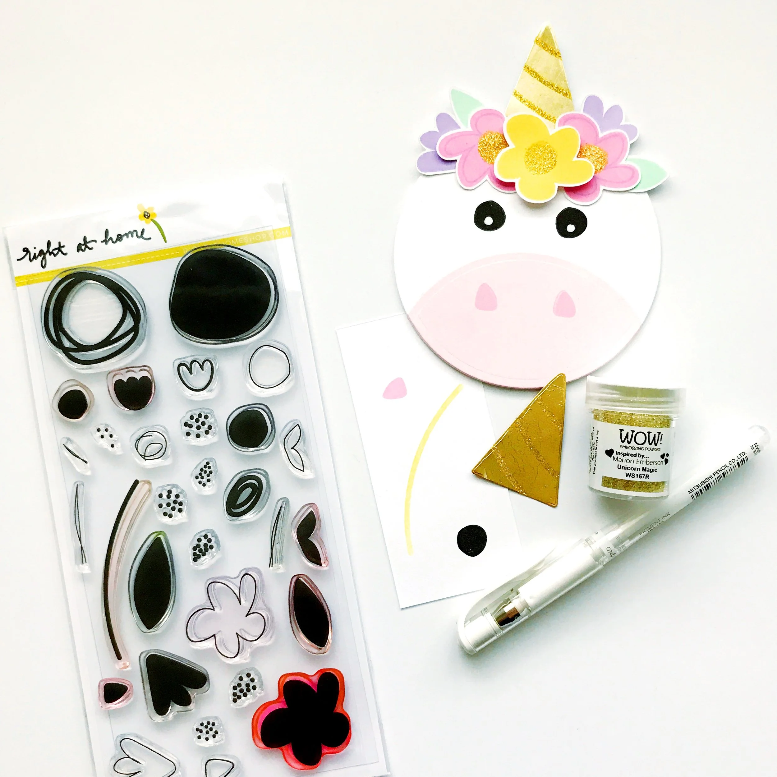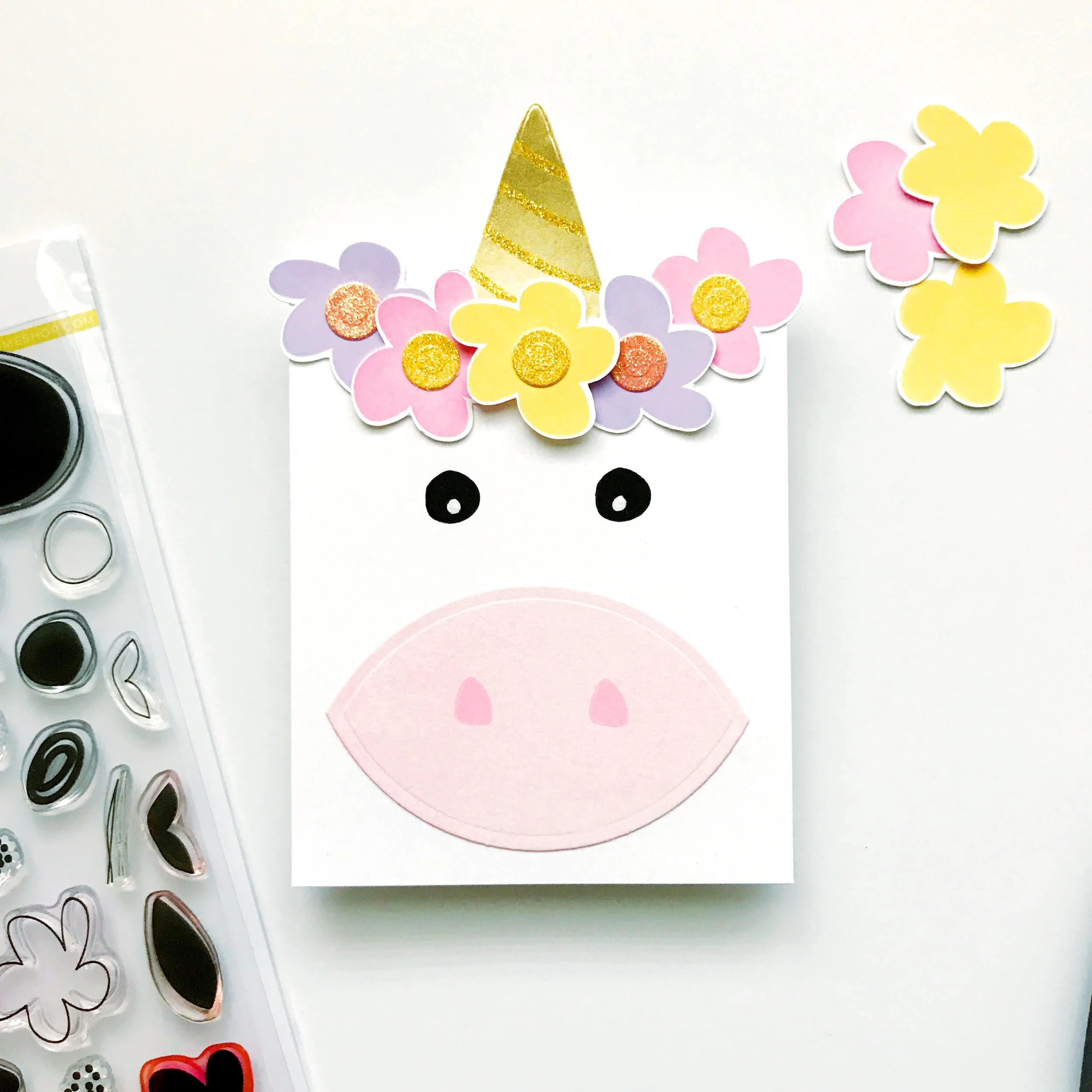 I used some basic circle dies to create my unicorn’s nose, running it through twice to get the curve on both sides. I inked it in a soft pink and used the little daisy center stamp to create nostrils. I used the stem to stamp & emboss in gold glitter, stripes on a basic triangle die cut to make the horn. And another flower center stamped in black made perfect eyes, with a little white pen on top.