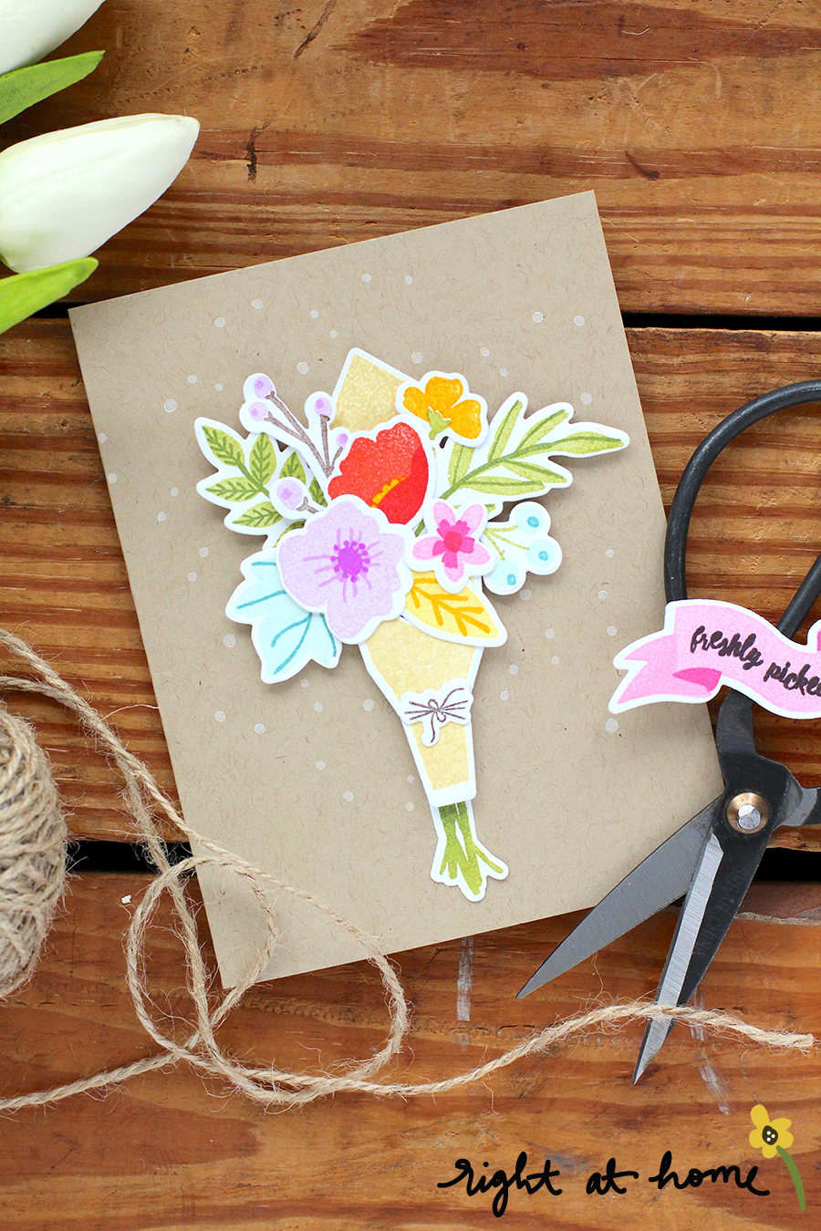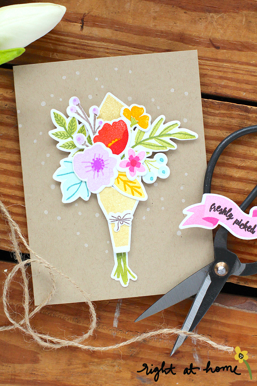 Next I got to work on assembling my freshly picked bundle! I used both foam tape and tape runner adhesive to glue all the elements onto a kraft A2 size cardbase. I encourage you to have fun making your arrangements, but if you do need a little help you can download my stamping guide here. Once you have all the florals arranged, you can add in the little triangle piece at the top of your bouquet to make it look as though your entire bundle is wrapped in paper. I also stamped a few dots in a white pigment ink around my bundle to add some more detail.