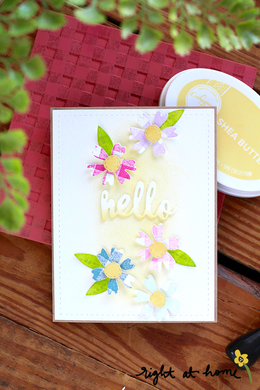 Once my background was inked to my liking I adhered the flowers with liquid glue. I also glued together three layers of the "hello" die-cut to create a dimensional sentiment. Along the bottom of the layered die-cut I inked on some Shea Butter to help it blend into the background. I popped the panel onto an A2 sized kraft cardbase and my card was complete.