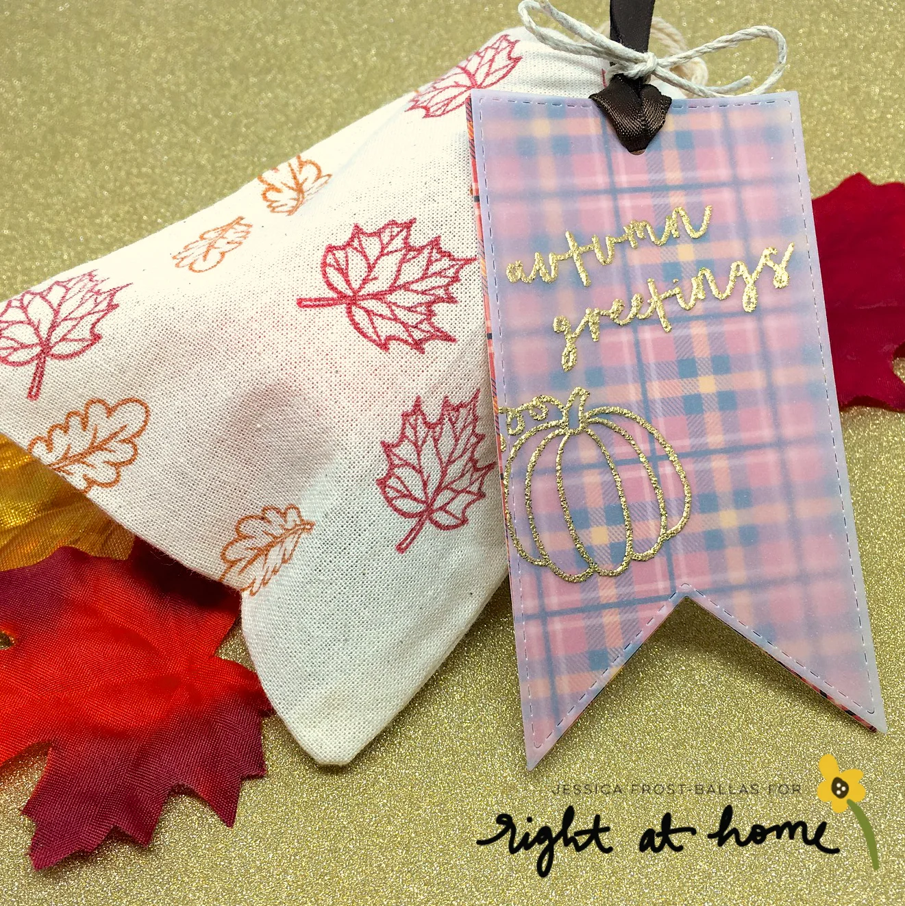 I stocked my box with a few crafty items and a bunch of fun autumn gifties! I attached a card to the top of the box and decorated the envelope with a floral stamp from Find the Beauty. I also included a set of blank cards that I made using Grateful Heart as well as a custom stamped linen bag that I stuffed with catnip cat toys! I included a tag with a note indicating who the toys were for! ;)