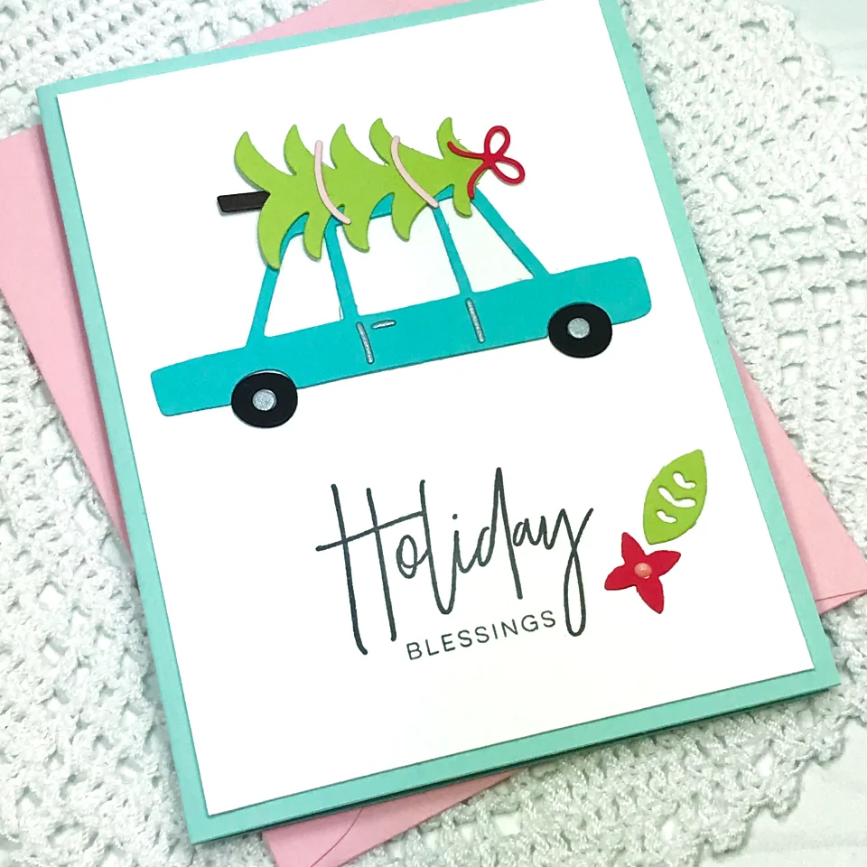 I started with a piece of white cardstock and stamped my sentiment along the bottom half. I then die cut all of my car and tree pieces and attached those just above my sentiment. There are so many fun little extras in this die set that make decorating the tree a lot of fun.