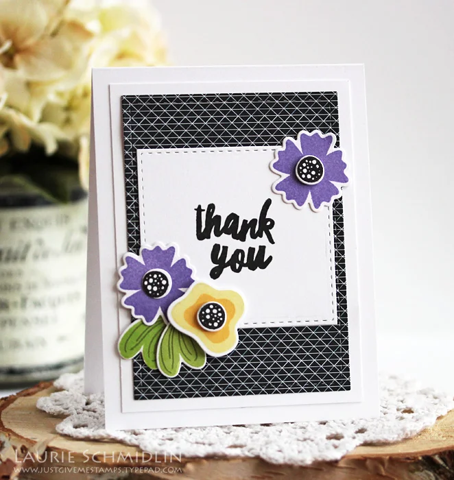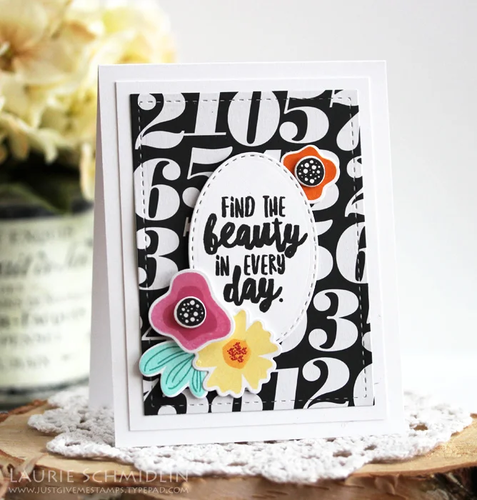 I tucked three different cards into the box, complete with matching envelopes. I wanted to create some non-holiday themed card so the recipient could use them year round. All three cards feature the Find the Beauty stamp set and coordinating Find the Beauty Die Set. I just love that this set now has coordinating dies...and included the best rectangle stitched dies! I used the smaller rectangle to cut out the patterned paper panels on all three of the cards.