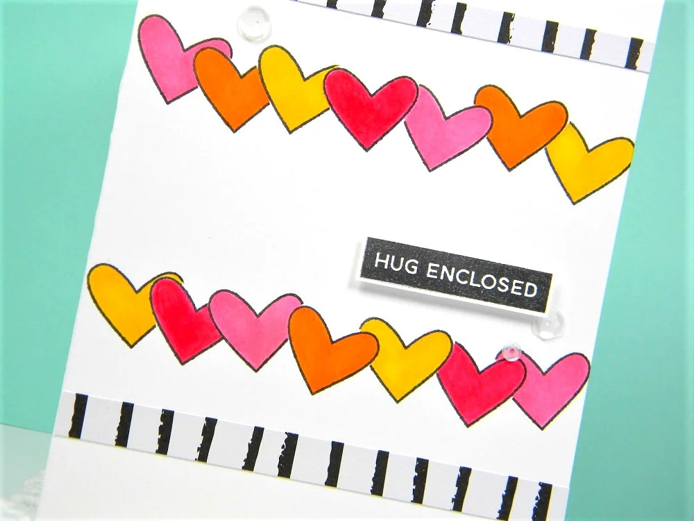 Now for my sentiment, from the absolute sweetest little mini stamp set, Happy Mail Year 2. I just received this not too long ago and it didn’t take me long to fall in love with it. It makes stamping your envelopes so much fun, but it also works perfectly on the cards themselves. That’s what I did for today. I used the "HUG ENCLOSED" for the sentiment on my card. After stamping it in black ink, I trimmed it out and attached it with dimensional foam. Lastly, I added a strip of striped patterned paper, along the bottom and top, and a few sequins to complete it.
