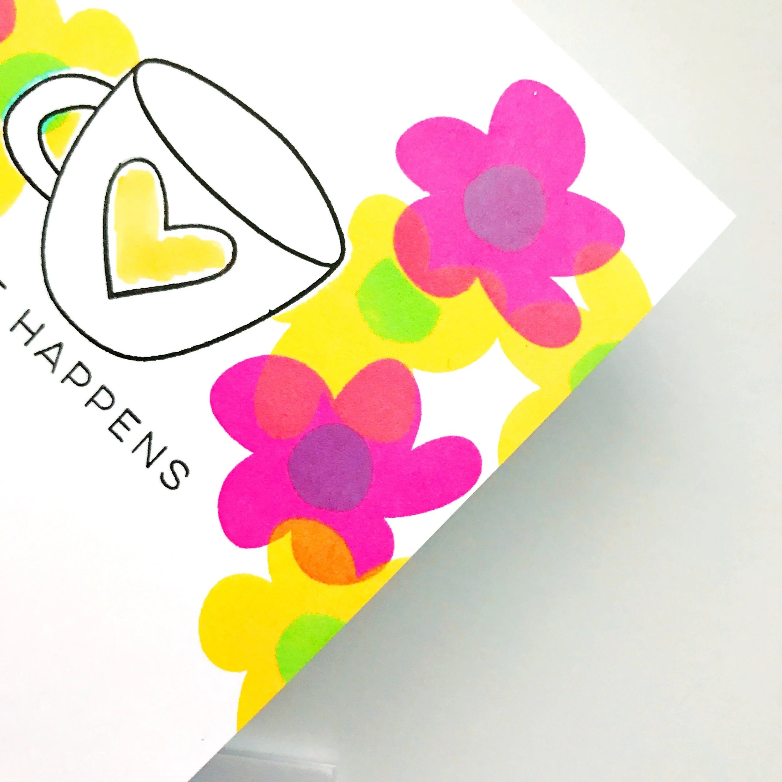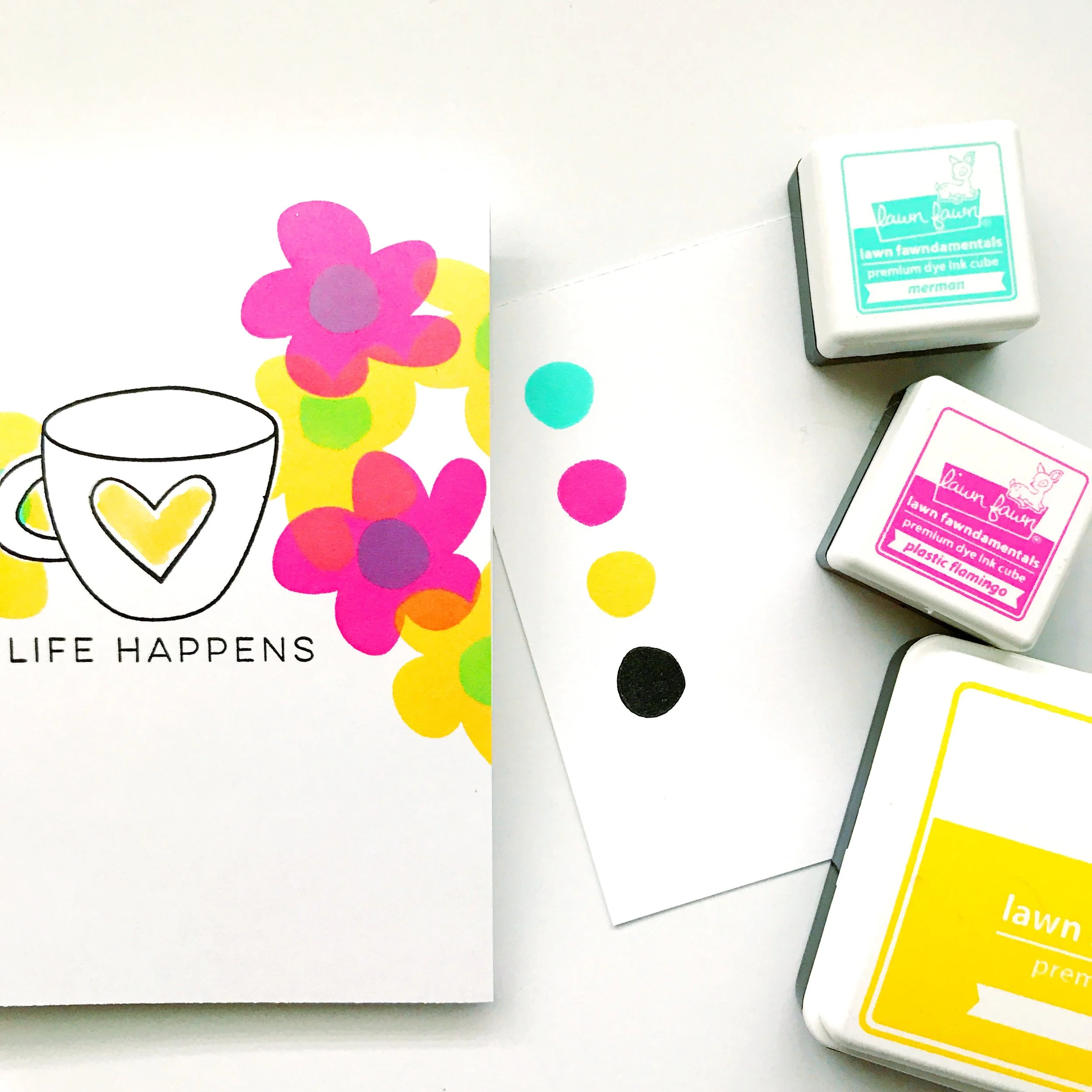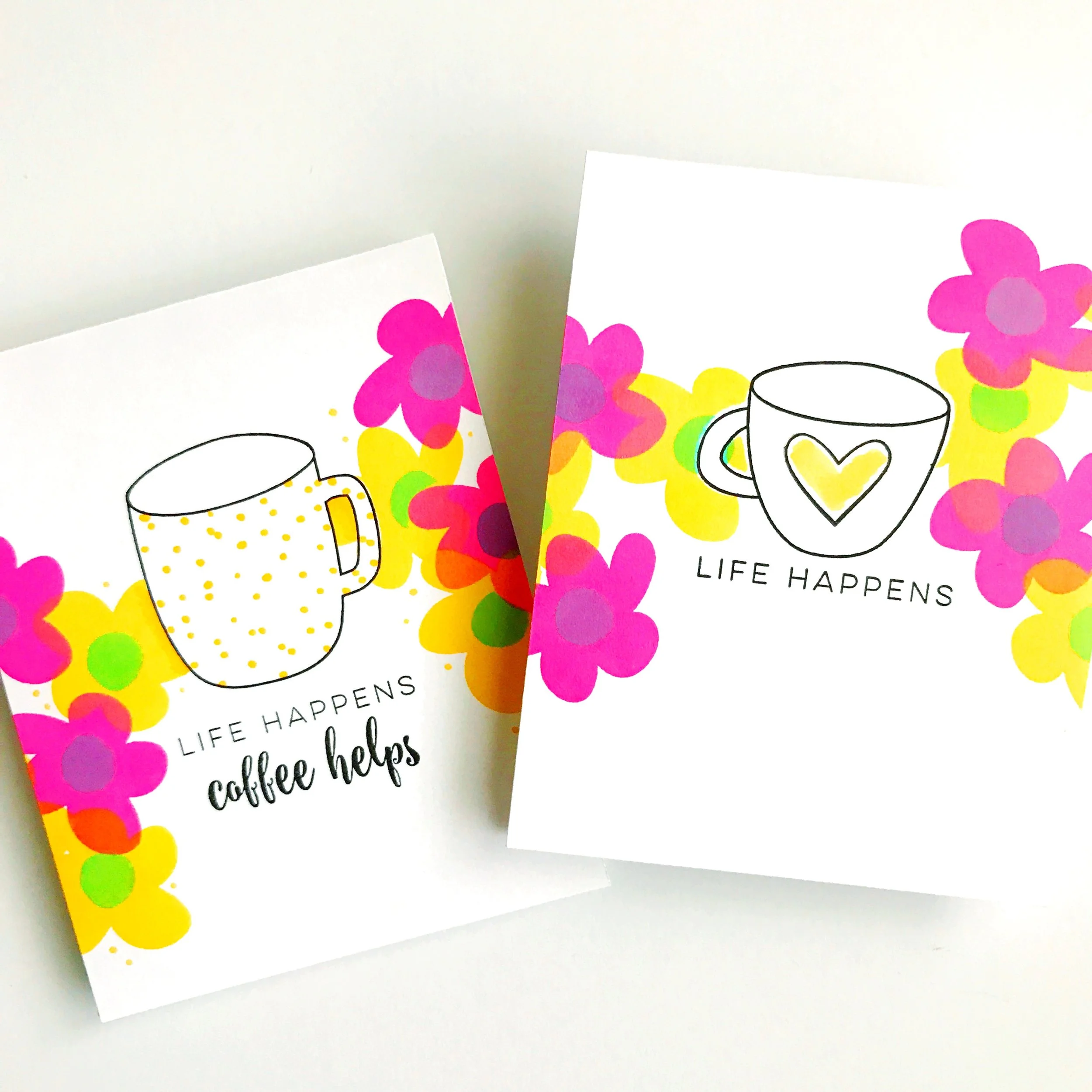 To start, just create your A2 card as desired. I stamped a coffee cup, then masked it before using dye inks in a CMYK (cyan, magenta, yellow & black) color palette and Abstract Florals to create a colorful & mod background around my coffee cup. I love the way the CMYK dye inks blend to create other colors.