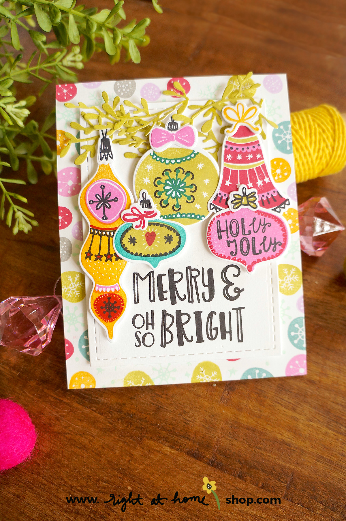 I nestled in the tops of the ornaments between the leaves and added the ornaments right below. Any ornament that had an accessory like a bow was adhered using tape runner adhesive. Once my panel was finished I popped it onto the background panel which was adhered to an A2 size cardbase. And my merry, bright and festive holiday card was finished!