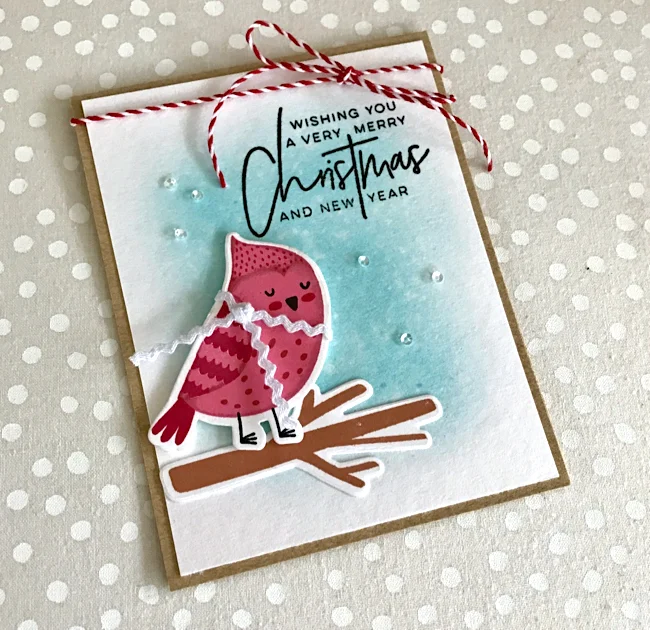 With the help of my MISTI, I pieced together the bird from the Cozy Cardinal stamp set. After stamping, I die-cut both the bird and the branch using the coordinating Cozy Cardinal Die Set. I wrapped a piece of white ric-rac around the neck of the bird as a scarf. As a finishing touch, I adhered some tiny clear sequins to the card and added a twine bow.