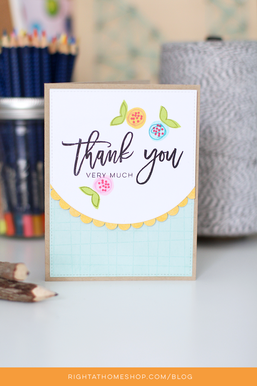 Since it's a special day I knew I wanted to try and create a card that was a little out of my comfort zone. I always stick to the typical square and rectangle focal panels for my cards so I thought I would switch it up and create a curved edge on my panel instead. I stamped the "thank you" from my Script Greetings set in the center and a few of my flower images from my Abstract Florals set around it. To tie in the flowers with the sentiment, I stamped the "very much" overlapping the little bud to add some depth.