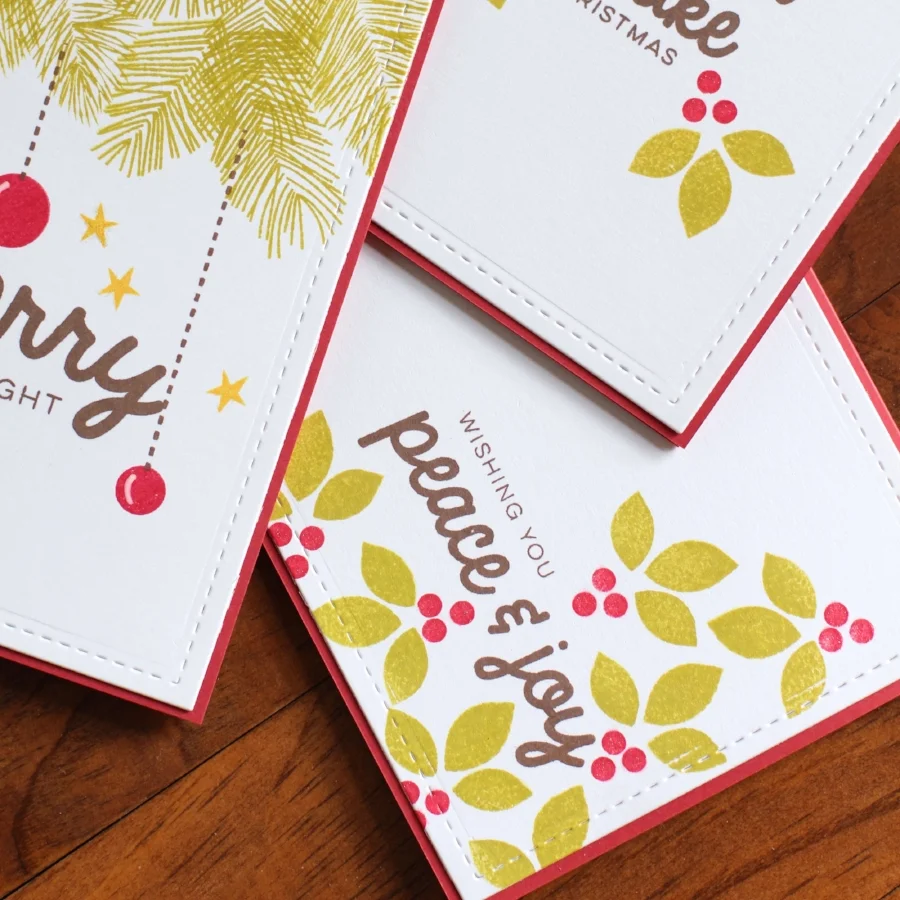 This next card is kind of like the step up from the first. I decided to rotate my panel and fit my smaller sentiment in the bottom, right-hand corner. Then I used the same leaf cluster and dot stamp to create multiple holly clusters around the greeting. I turned the leaves in different directions to better fill the space and made sure to keep my cluster count to an odd number (I have seven holly clusters in total).
