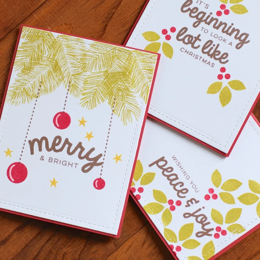 How's your holiday season been so far? I spent the day shopping around some of my favorite stores like Anthropologie, Sephora, etc. so I'm definitely in the Christmas spirit...at least in the present-buying spirit! Luckily, I was able to squeeze in some crafting time so I have three simple, one layer card designs for you today using a variety of my holiday stamps.