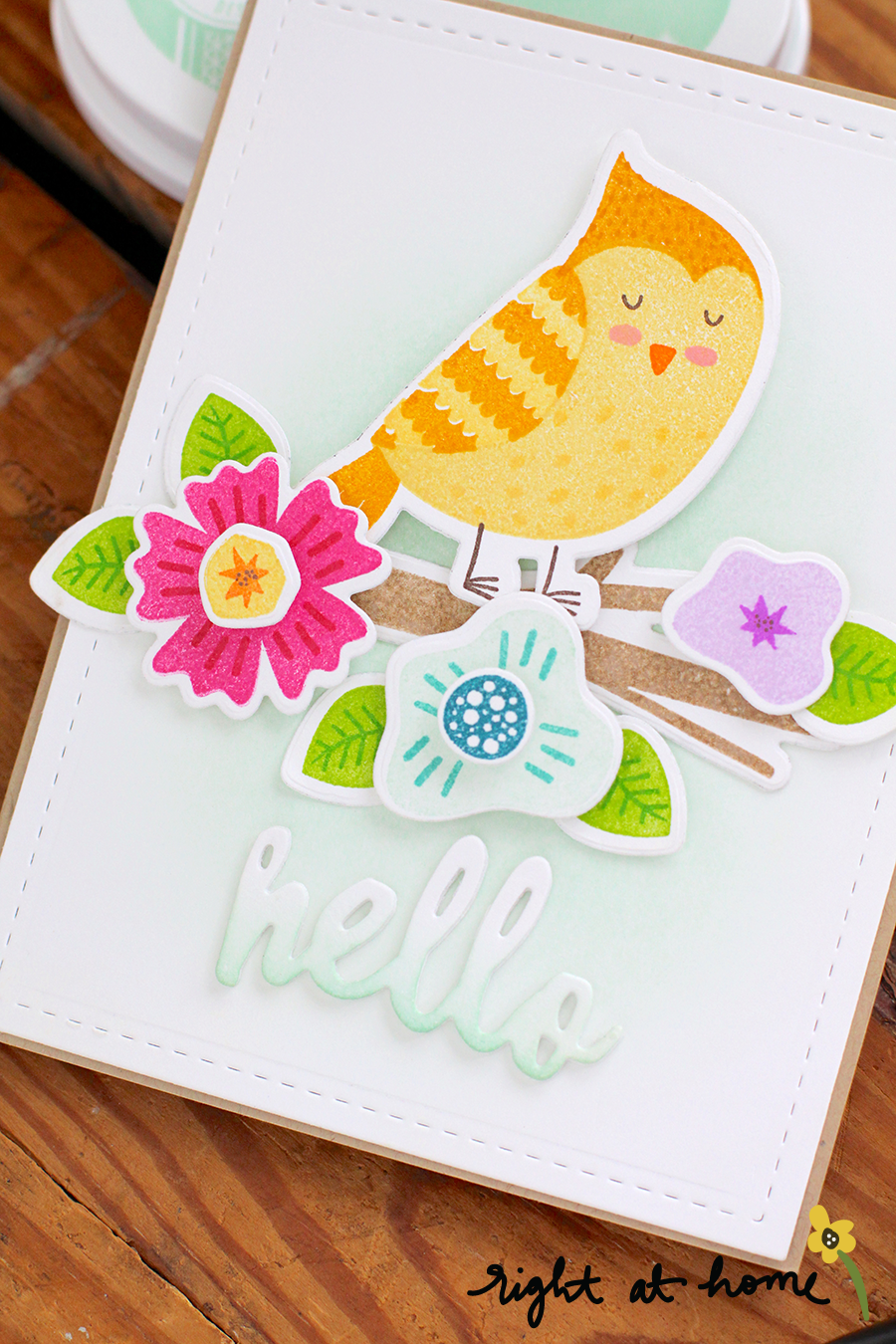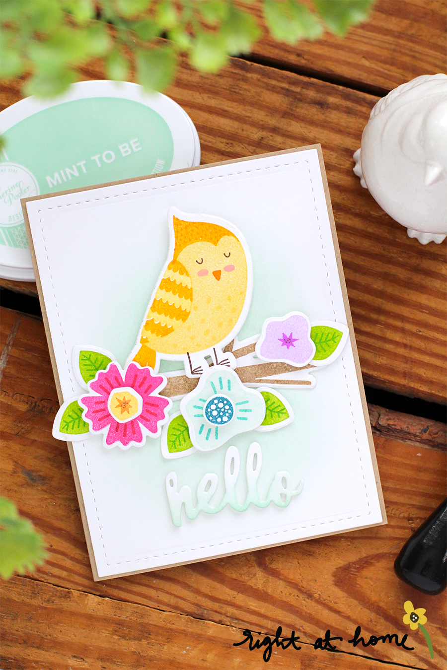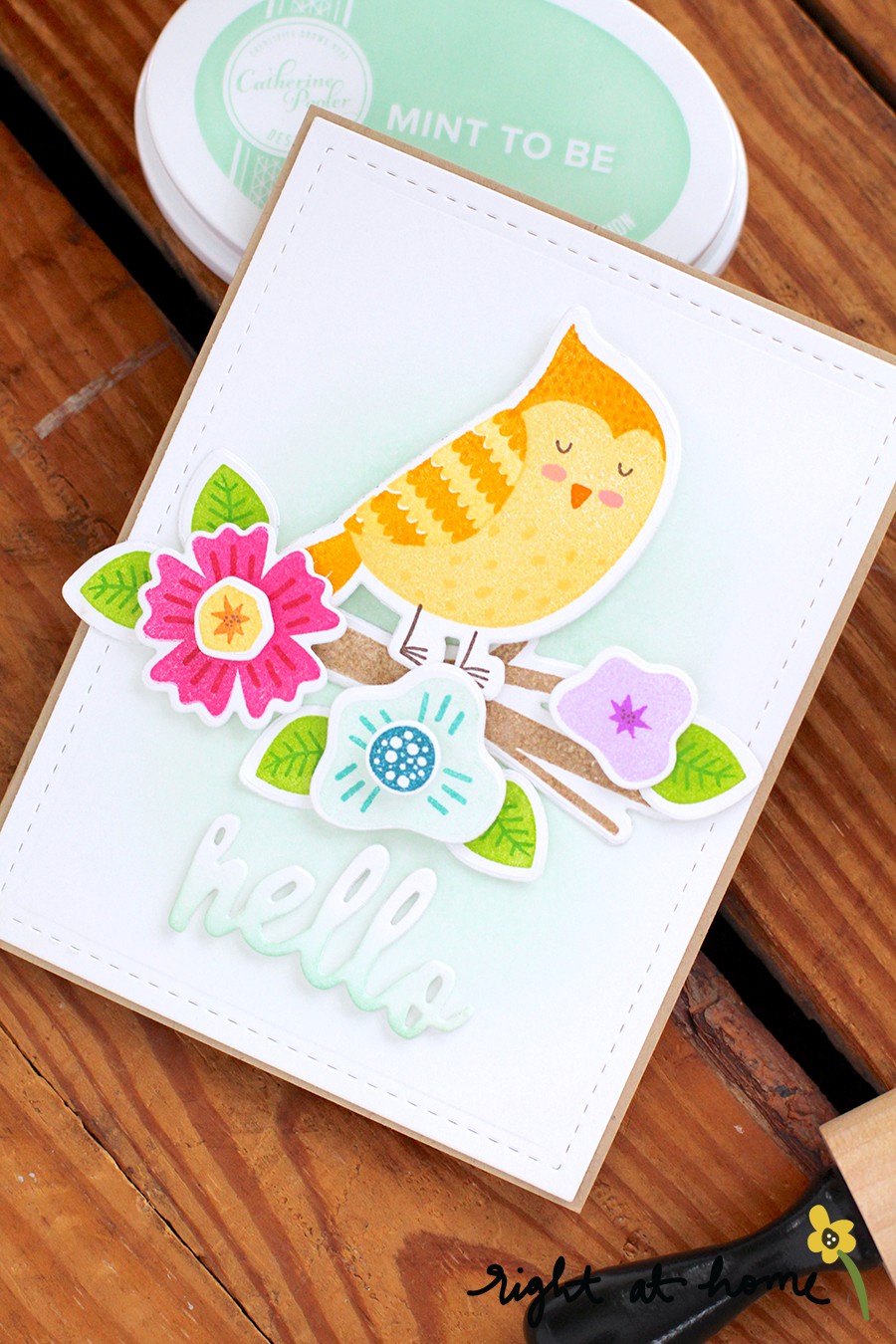 Along the bottom panel I adhered a "hello" die-cut sentiment that I inked with Mint to Be and a touch of Aquatini. I stacked a few additional die-cuts underneath the inked one to add dimension. I adhered the finished panel onto an A2 sized kraft cardbase and my card was finished!