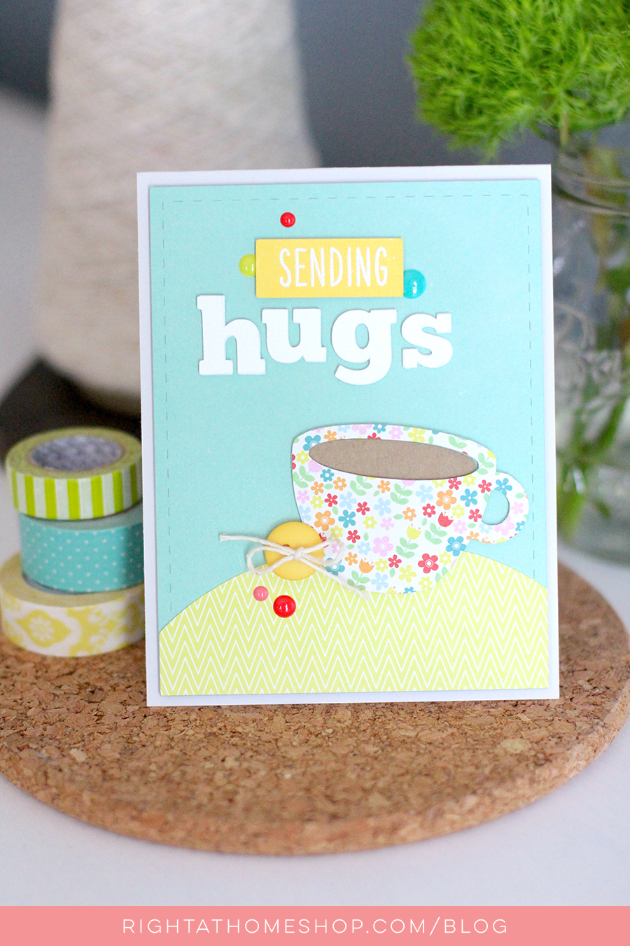 As a result, assembly was pretty quick. I white heat-embossed "sending" from my Simple Sentiments stamp to finish off the "hugs" greeting. I added foam tape behind some of the elements and kept the rest flat. I added a few embellishments like a button tied with twine and some enamel dots. They add a touch of dimension and additional color to an otherwise simple card design.