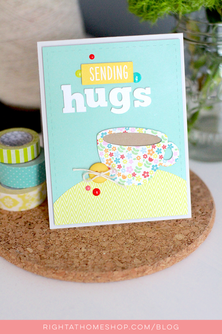 While designing my card I wanted to keep things bright and colorful yet simple to assemble as I was short on time. Due to that, I used my Silhouette Cameo for a majority of the elements. I cut out my coffee cup, stitched rectangle panel, curved hill, and "hugs" sentiment out of various cardstocks and patterned papers that I had on hand.