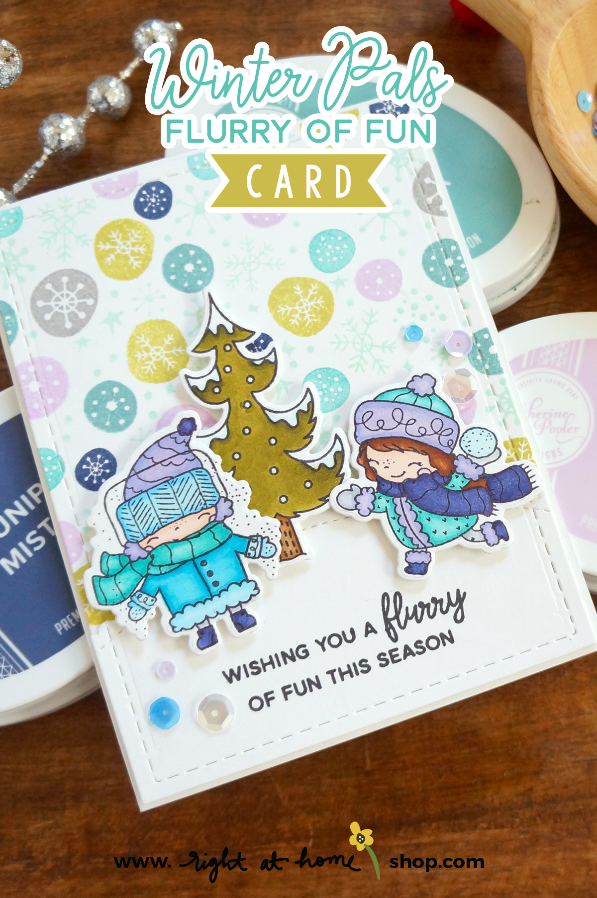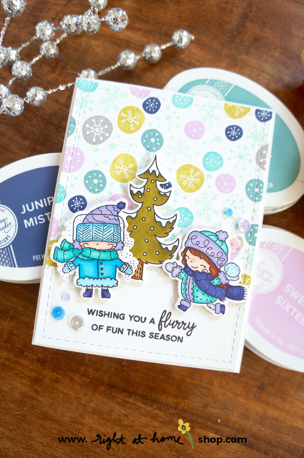 I started by stamping my background using the Snow Flurries Background Stamp. I stamped the large background in a light blue ink and filled in all the open spaces with a variety of Catherine Pooler ink colors (listed in the products used section below). If you want a simpler background, you can just stamp the base layer, but you know me, the more color the better!
