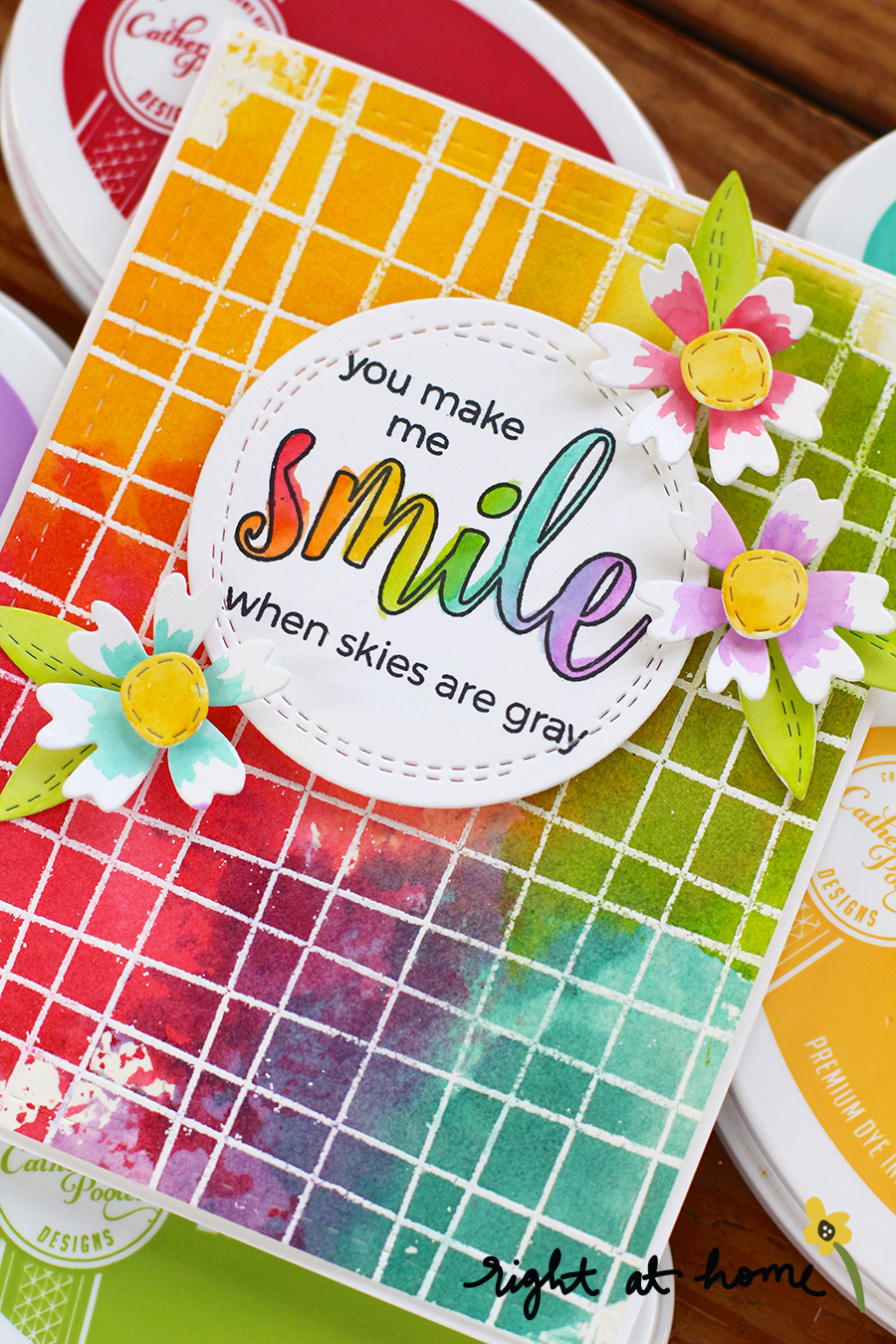I set my panel aside to dry and started working on my sentiment circle that I die-cut from my Sweet Stitches Die Set. Onto the center of it I stamped a greeting from my Color in Sentiments set which coordinates perfectly with my rainbow theme. I made sure to stamp it in a waterproof ink as I knew I was going to fill in the "smile" with watered-down dye ink. I added all the colors I used onto my background (listed below), picked them up with a waterbrush and colored in my word.