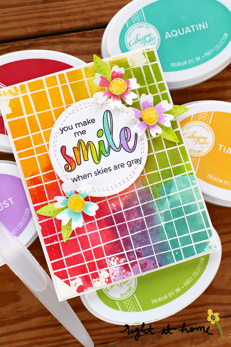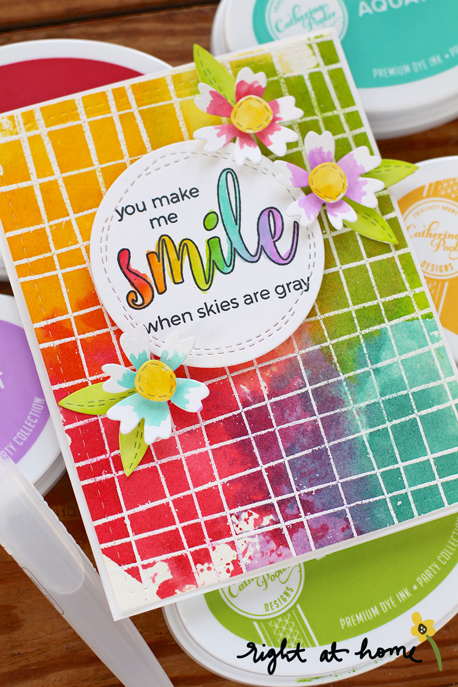 For my background I white heat-embossed a piece of watercolor paper with my Grid Background Stamp. Once it was heat-set, I began adding color using the ink smooshing technique. Basically, you dab a bit of dye ink onto a piece of acetate, add some water to activate it and smoosh it onto your panel. It's really quite easy to do!